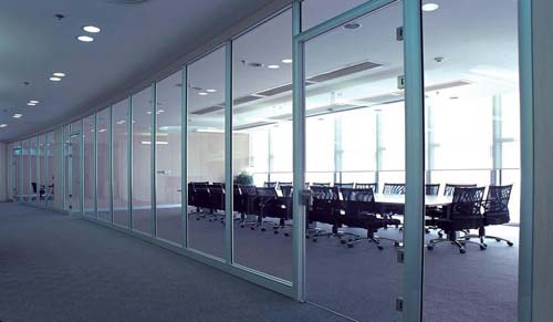 (11)南寧辦公室裝修固定玻璃門扇上下門夾:定好門扇高度后,在厚玻璃與金屬上下門夾內的兩側縫隙處,同時插入小木條,輕敲穩實,然后在小木條、厚玻璃、門夾之間的縫隙中注入玻璃膠。