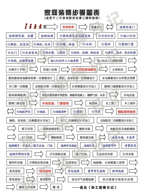 裝修是一件極其麻煩的事情。為了清晰的裝修脈絡和步驟指導,我們先來看看在裝修工地上干了十幾年的孫工列的一張裝修流程圖。