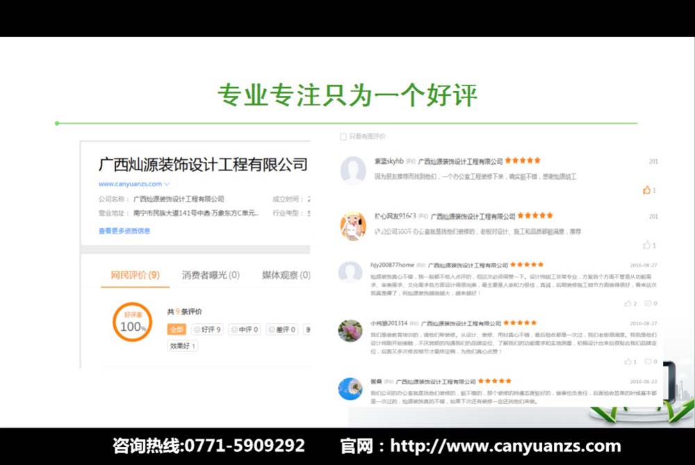如果我們完成了上述找尋較好裝修公司的“九看”之后,我們一定要好好的完成這較后一個環(huán)節(jié)——聽口碑。俗話說“酒香不怕巷子深”,一家真正好的裝修公司即便不打廣告,人們照樣會去找它,因為它已贏得了客戶的信賴和良好口碑,結(jié)果口口相傳,從而你會聽其口碑,慕名而來。